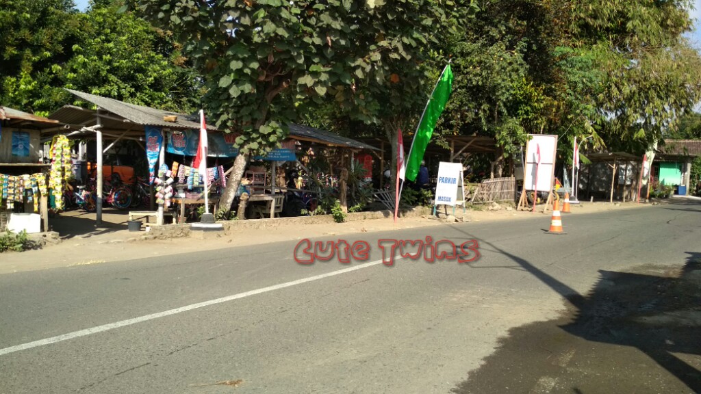 Kami memarkir motor kami di tempat parkir pinggir jalan, tepatnya di depan penjual jajanan pasar yang ramai banget.